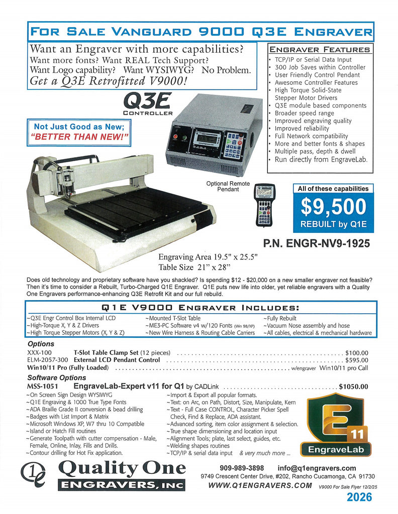 Vanguard 9000 Good Used Rebuilt Engraver For Sale w/ New Q1E Q3E Controller 2026.