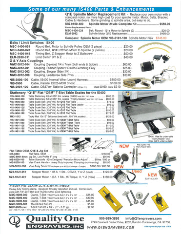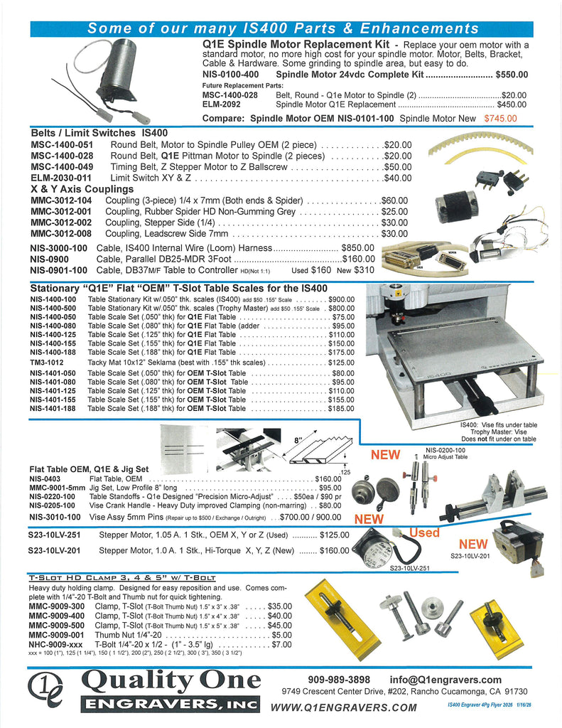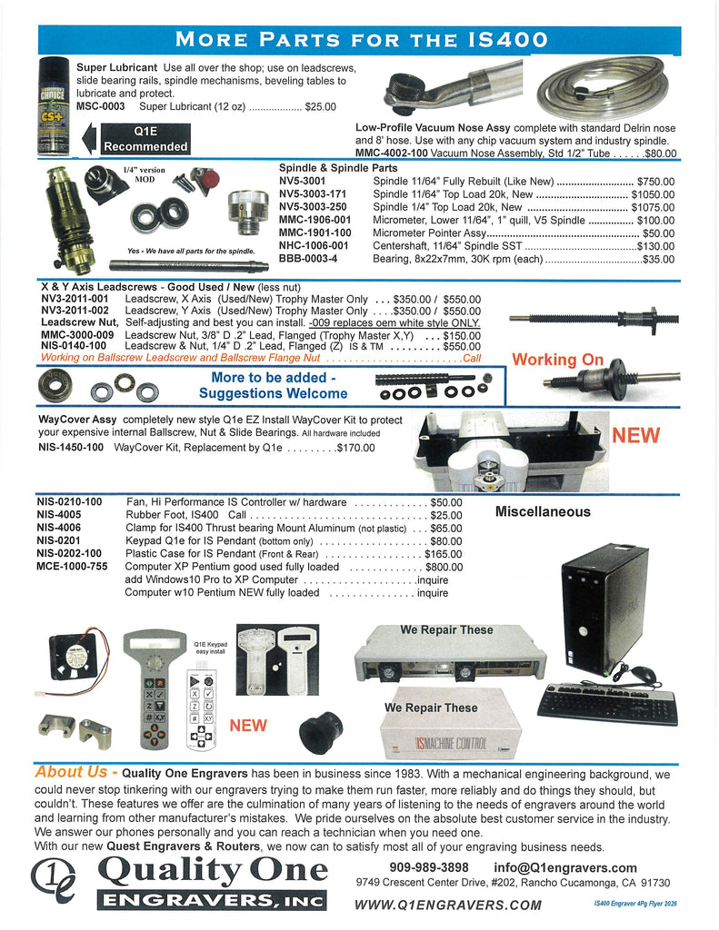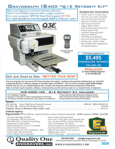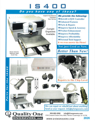 IS400 New Hermes Gravograph Engraver 4pg flyer_2026 in pdf format. Retrofit Kit, Parts, Accessories and more. IS-400. If other items required and not seen call 909-989-3898 or email info@q1engravers.com for possible new products and future additions.