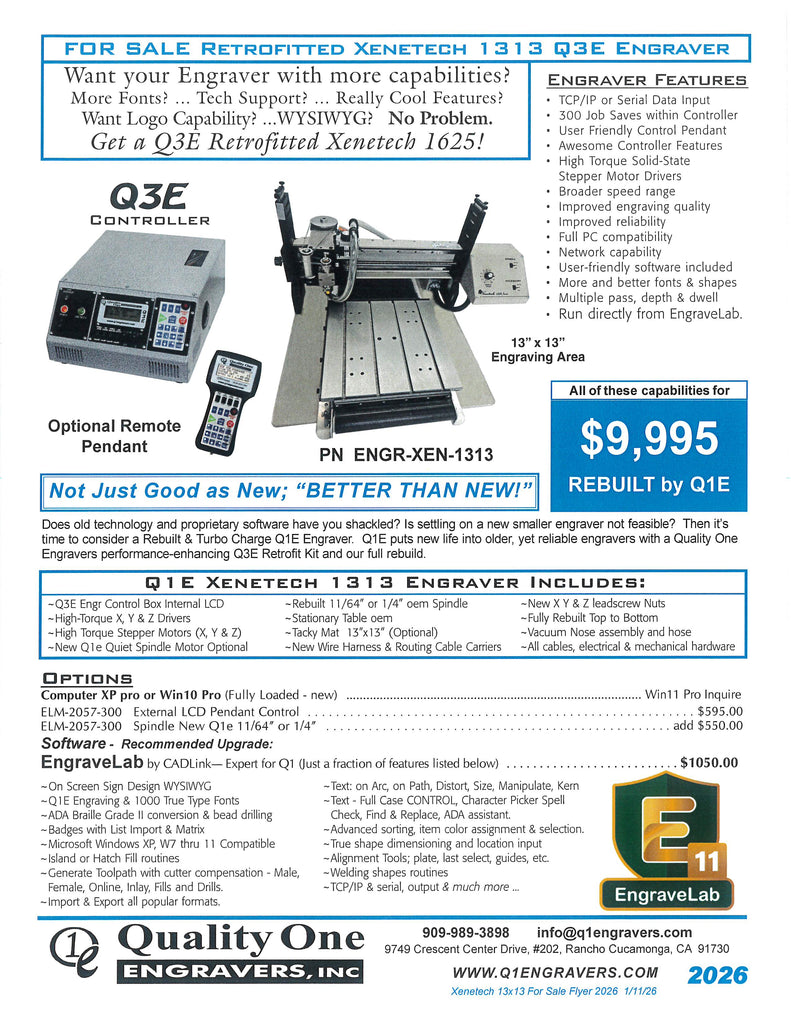 Xenetech 1313 Q3E Engravers for sale, these engravers come with New Q1E Controller with built-in pendant.